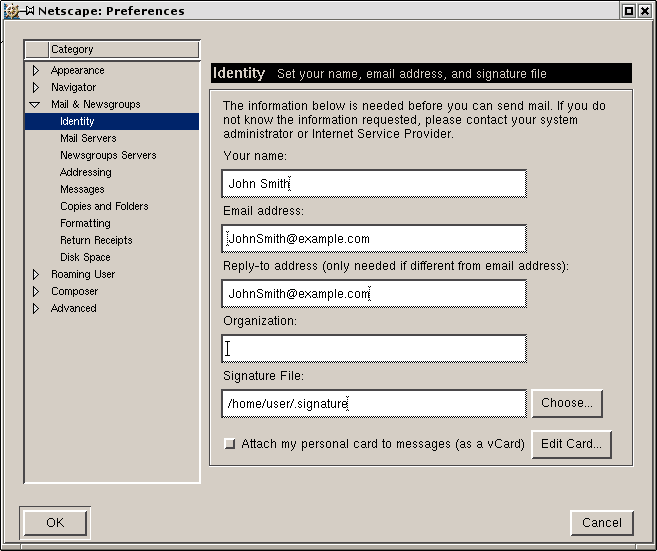 - Click Mail and Newsgroups in the left menu and select Identity. On the page that appears: