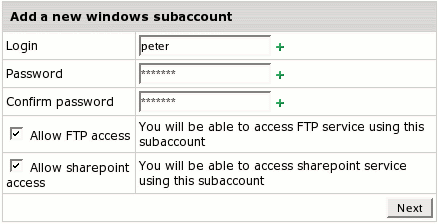 both, and enter Login and Password that will be used by FTP subuser and SharePoint user: